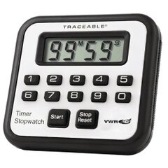 TIMER, NUMBERED KEYS MAKE PROGRAMMING EASY, CAN OPERTE AS STOPWATCH, HIGH DECIBEL ALARM CAN BE TURNED OFF MANUALLY OR IS SILENCED AFTER 1 MINUTE, TRACEABLE TO NIST